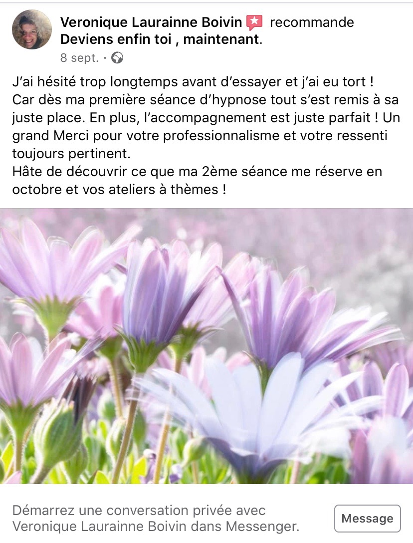 "J'ai hésité trop longtemps avant d'essayer et j'ai eu tort ! Car dès ma première séance d'hypnose tout s'est remis en place. En plus , l'accompagnement est juste parfait ! Un grand merci pour votre professionnalisme et votre ressenti toujours pertinent. Hâte de découvrir ce que ma 2 eme séance me réserve en octobre et vos ateliers à thèmes !"