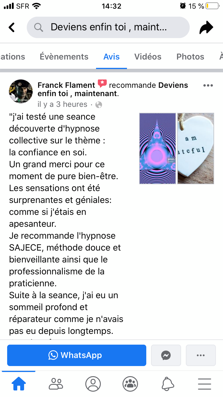 "Très heureuse d'avoir pu participer à votre première séance d'hypnose collective , je me suis réellement sentie transportée et j'en ressors plus confiante. Je vous souhaite pleins de belles choses et de réussite pour la suite et vous recommande vivement.