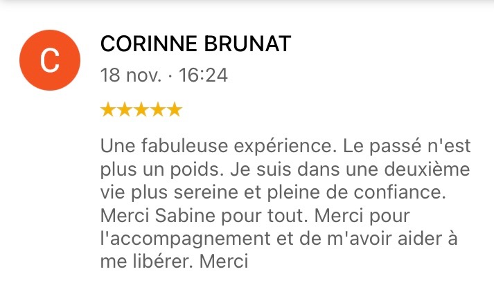 " Une fabuleuse expérience . Le passé n'est plus un poids. Je suis dans une deuxième vie plus sereine et pleine de confiance . Merci pour l'accompagnement et m'avoir aider à me libérer. Merci"