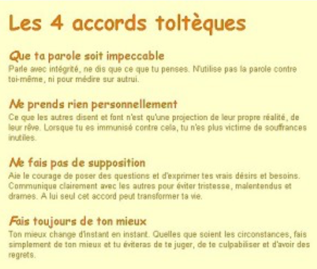 Miguel RUIZ , auteur du livre " les 4 accords Toltèques " propose de passer avec soi quatre accords visant à briser nos croyances limitatives. Celles que nous développons depuis l'enfance , qui distordent la réalité et nous maintiennent dans la souffrance. A force de conditionnements culturels et éducatifs ( sur ce qui est juste ou faux , bon ou mauvais , beau ou laid ) et de projections personnelles ( " je dois être gentil ", " je dois réussir " , ... ) nous avons intégré une image fausse de nous-même et du monde.